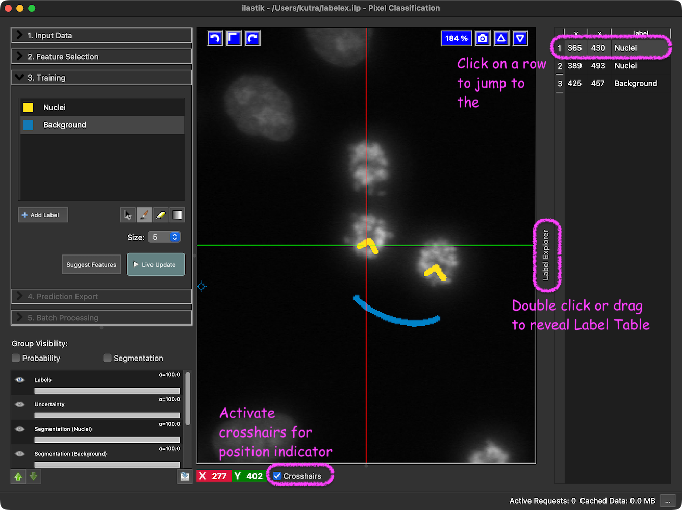 Some steps in ilastik involve labeling your data, either in the form of brush stroke annotations (e.g. in Pixel Classification, Autocontext, Carvingca), or class assignments for objects (in Object Classification and Tracking). To quickly navigate between different manual annotations, these steps in each ilastik workflow have a “Label Explorer” on the right side next to the viewer. The Label Explorer can be opened by either double clicking on the Label Explorer caption, or clicking and dragging towards the center. Each row in the table represents an annotation label. Clicking on the row will jump to the specific position in the central view. You can indicate the position of the label more clearly by activating the Crosshairs with the checkbox in the lower left. The Label explorer can be closed by double clicking the Label Explorer caption or clicking and dragging the divider towards the right.