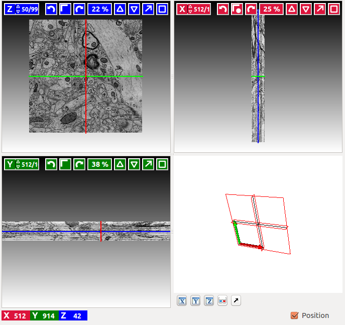 The red, green and blue lines indicate the current position (given by the slicing position of the three planes). These lines can be hidden with the Position checkbox in the lower right.