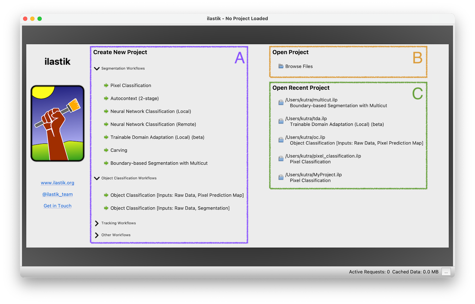 The first thing you see when starting ilastik is the startup screen.